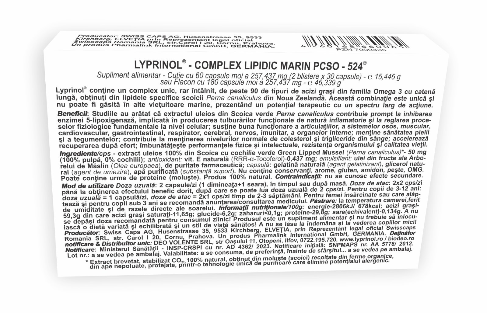 Nu s-au constatat contraindicatii sau efecte secundare, dupa 40 de ani de cercetare si studii clinice. Lyprinol este un produs de inalta puritate si nu interactioneaza cu alte tratamente (medicamente, suplimente etc.). Poate fi folosit si pe termen lung, nu creeaza dependenta, fiind recomandat tuturor categoriilor de varsta (de peste 3 ani). Lyprinol este un complex lipidic marin PCSO524, un produs 100% natural si nu necesita prescriptie medicala. Poate fi administrat persoanelor cu diabet, afectiuni cardiovasculare sau care iau anticoagulante.